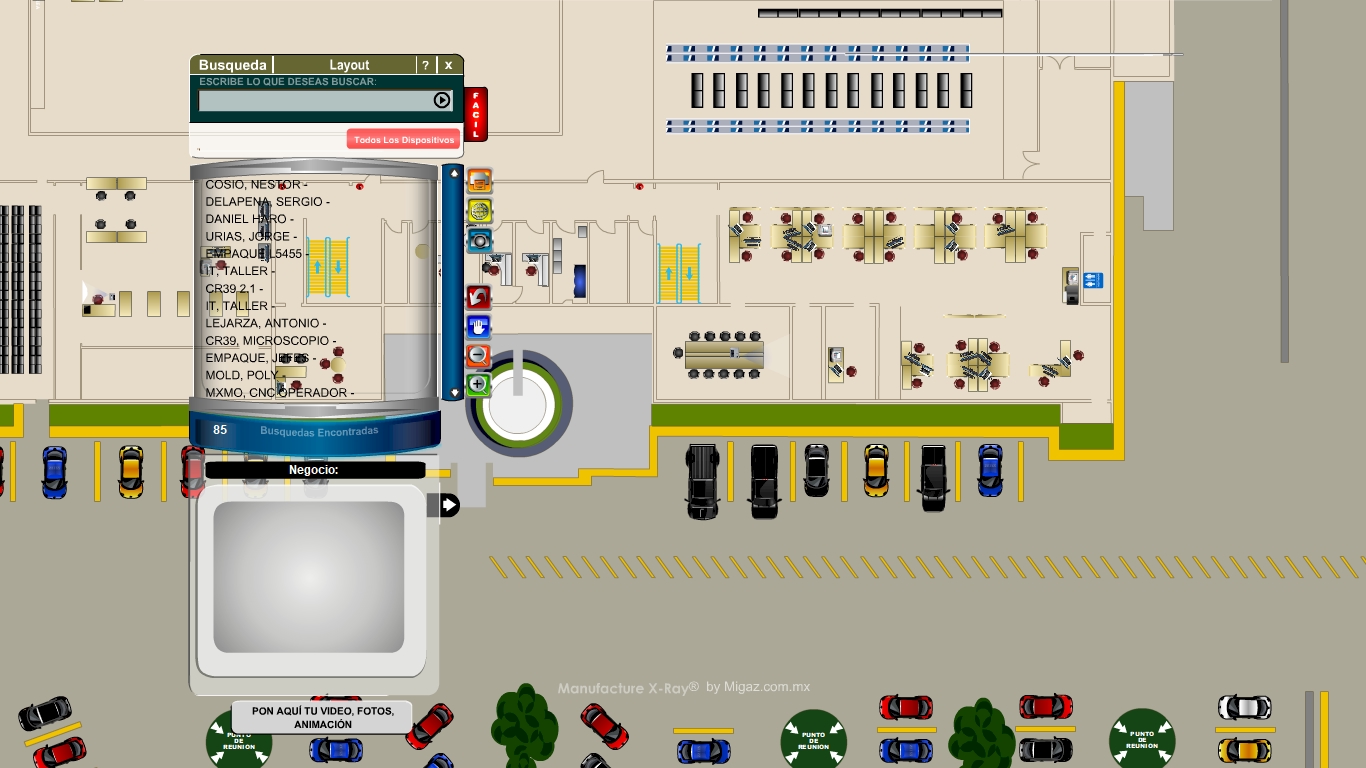 Manufacture X-Ray. It is a project designed for the Maquila and Industry. Interactive map of industrial buildings where can be located and represente practically all the important processes and interact with them, with each coworker, operators, processes, computers, machinery, layers of electrical installations, networks, pipes, areas, parking lots, evacuation routes, bathrooms, etc . you can represent and interact with each of them as if you were physically there. Through interfaces to databases, connections to the NETWORK, personnel assistance systems, IP cameras, remote sessions, you can interact with all this as if you were there.: https://www.youtube.com/channel=DanielHaro